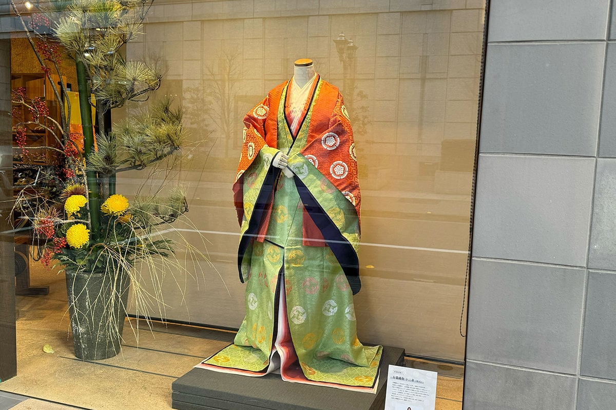 平安時代の公家女子の正装である「十二単(女房装束、裳唐衣)」を店頭展示いたします。略式ではありますが、平安時代の雅な色彩と織りを再現した伝統の有職織物をぜひご覧ください。