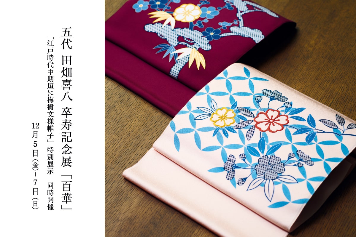 『五代 田畑喜八 卒寿記念展「百華」【同時開催】「江戸時代中期垣に梅樹文様帷子」特別展示』は、おかげ様で盛況のうちに終了いたしました。ご来場くださった皆様、オンラインでご覧になられた皆様に心より御礼申し上げます。