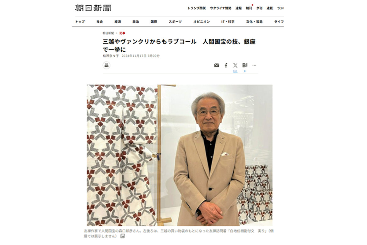 2024年11月17日(日)の朝日新聞デジタルにて、森口邦彦先生の個展の開催について取り上げていただきました。森口邦彦先生の生い立ちや今回の個展のために制作していただいた最新作などを写真と共にご紹介いただいております。