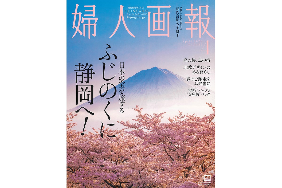 『婦人画報』4月号、ご挨拶の季節におすすめするバック特集内で、立ち姿をすっきりと見せる立涌柄の白大島紬に染帯を合せて素敵にお召しいただきました。ぜひ、お手にとってご覧ください。