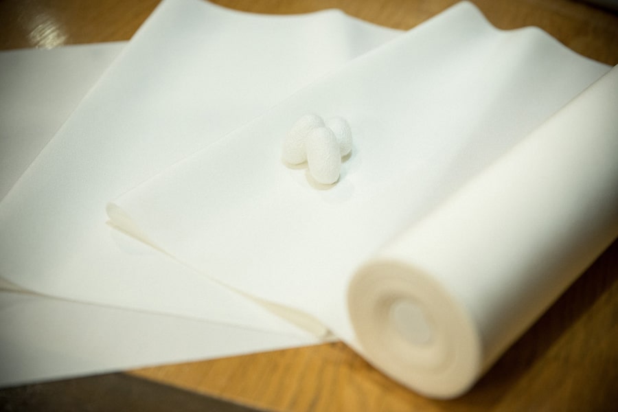 実際に「プラチナボーイ物語」に参加され、蚕に餌をやり、繭が糸になる段階や、生地に織り上げられる過程を見学・体験された萩原さんが、その反物でお仕立てされた着物をお召しになり体験された感想などを二代目・泉二啓太にお話くださっています。ぜひご覧ください。
