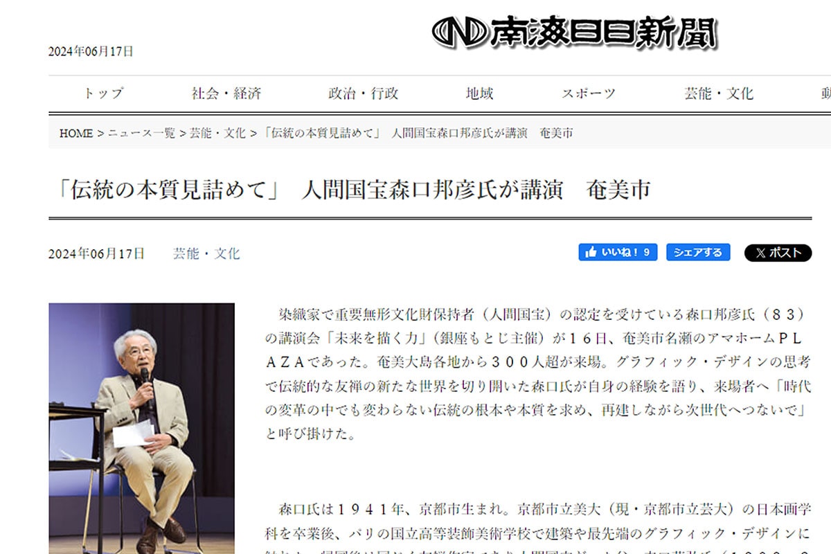 2024年6月17日(月)の南海日日新聞ウェブページにて、6月16日(日)に奄美大島にて行われた人間国宝・森口邦彦氏の講演会について取り上げていただきました。講演会では、300名を超える方々にご来場いただき、大盛況のうちに終了いたしました。