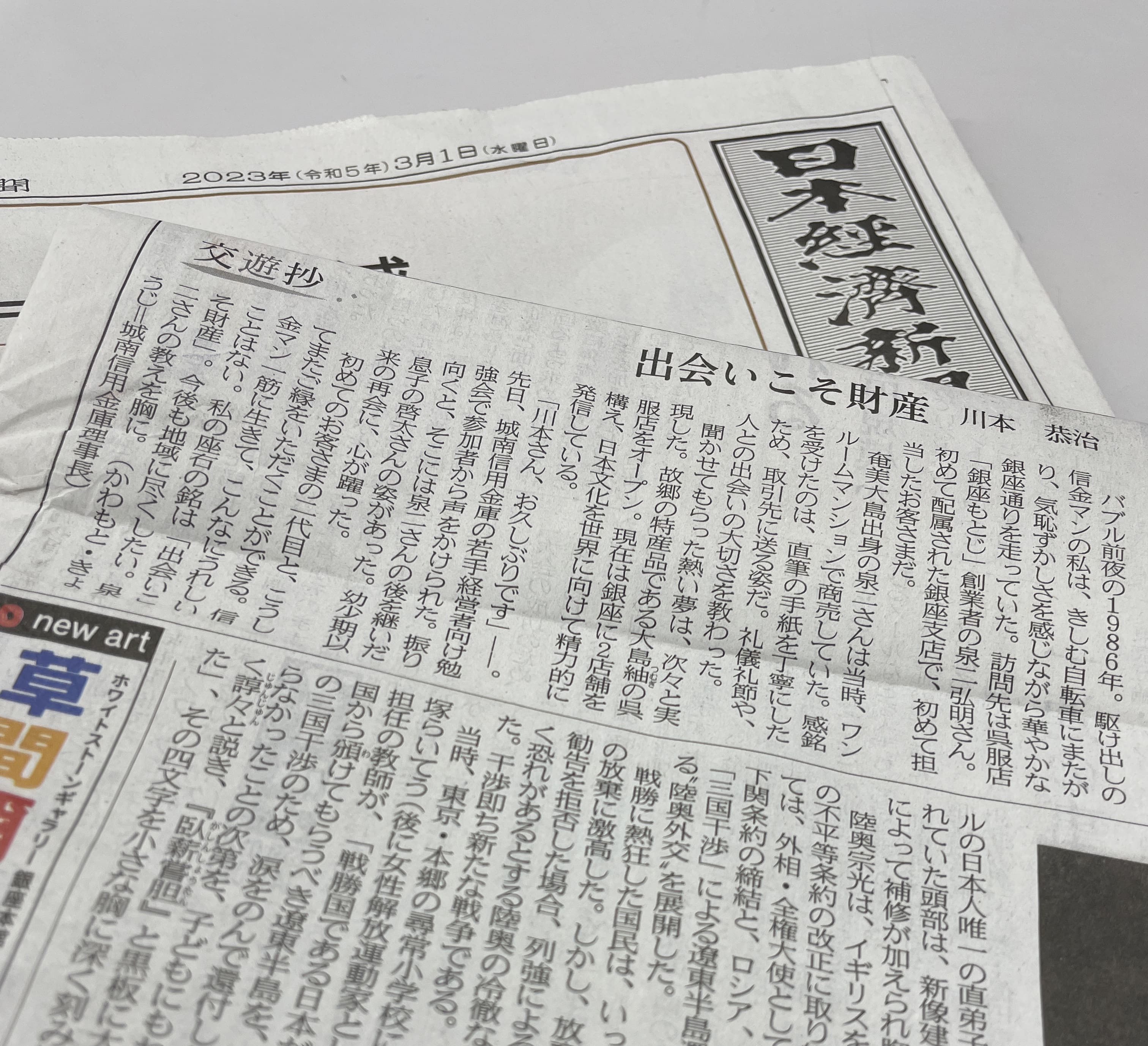 2023年3月1日(水)の日本経済新聞朝刊の「交遊抄」にて、城南信用金庫理事長の川本恭二さまに、1986年から続く創業者・泉二弘明とのご縁や泉二が大切にしている人との出会い。そして、2代目へと変わらず続くご縁について、川本さまの座右の銘「出会いこそ財産」として、ご紹介いただきました。