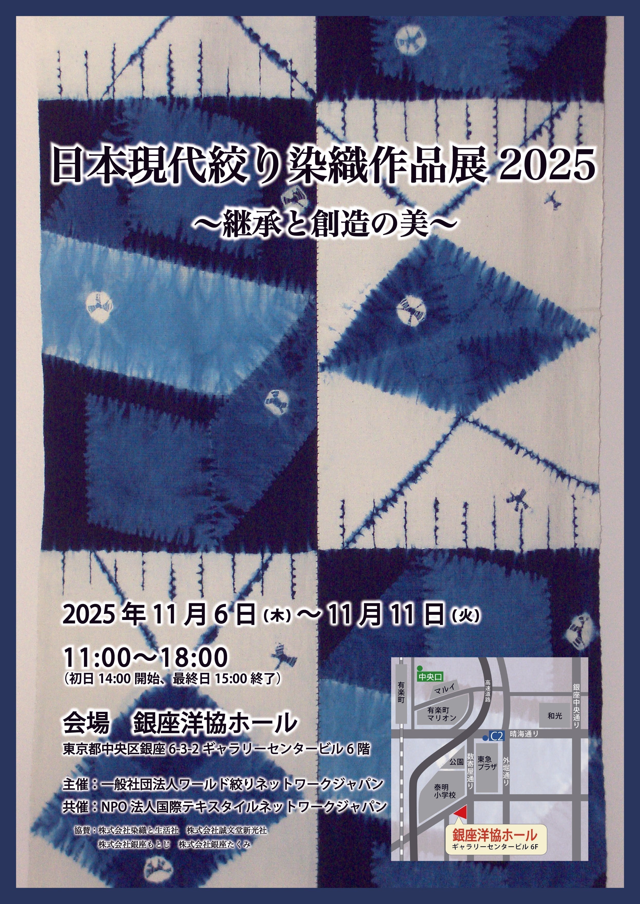 主催:一般社団法人ワールド絞りネットワークジャパン 日本現代絞り染織作品展 2025 事務局 染織をはじめとする諸工芸7つの部門の伝統の技術を現代の感性で磨き上げた素晴らしい作品が並びます。お近くの方はぜひ足をお運びください。