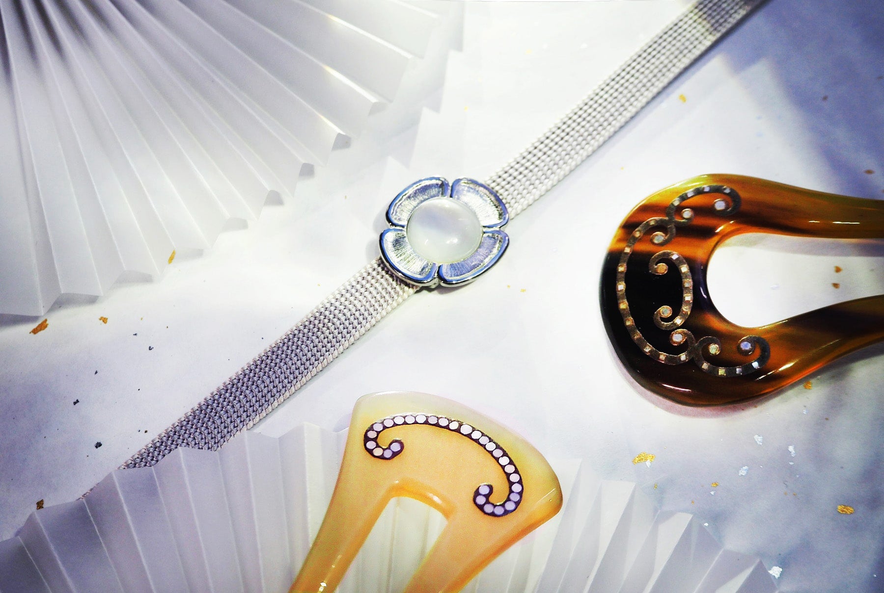 帯留は、シルクロード由来といわれる文様の折り目正しいイメージの中に、ムーンストーンの光の効果でゆれる心情を表現しています。