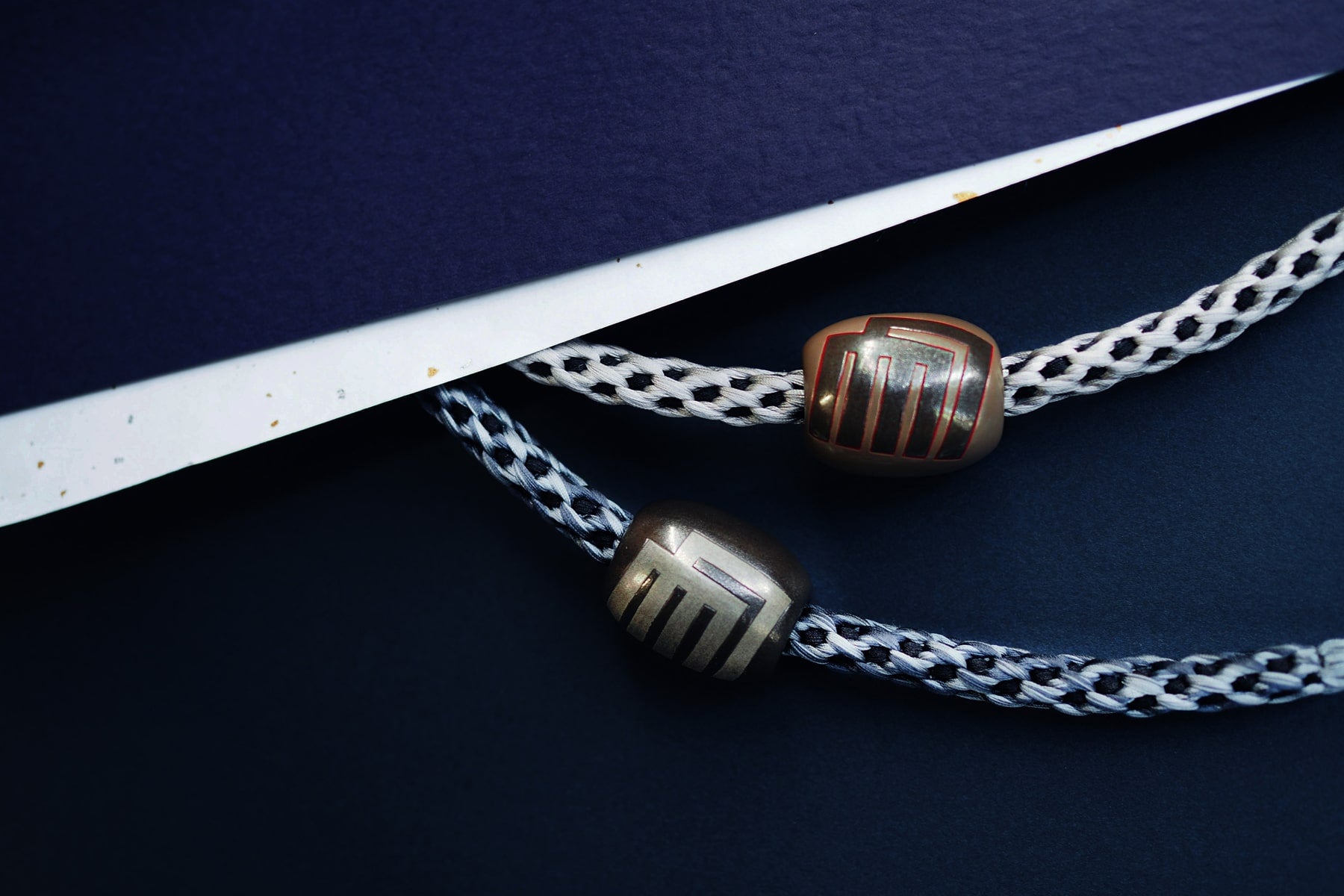 しばしの別れにあたり笛と黒馬を交換したストーリーから、ベージュと黒のツートーンの銀蒔絵で仕上げました。短めの仕立てでアクセサリー感覚の着用効果をねらっています。