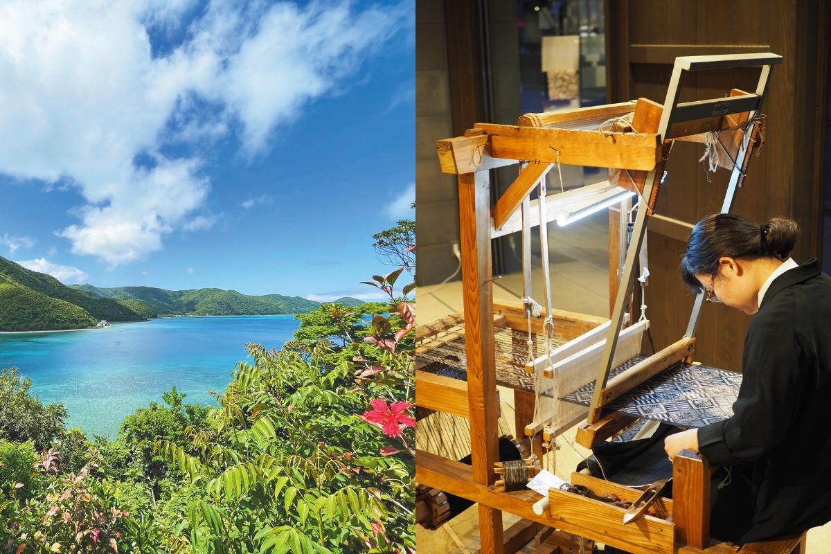 (写真左)奄美大島の風景(写真右)銀座もとじ和織店内の機織りの様子