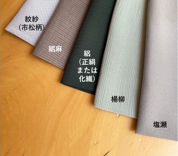 塩瀬、楊柳、絽縮緬等、季節ごとに適した素材を一覧いただけます。(パソコンの方は、クリックで大きな画像が開きます)