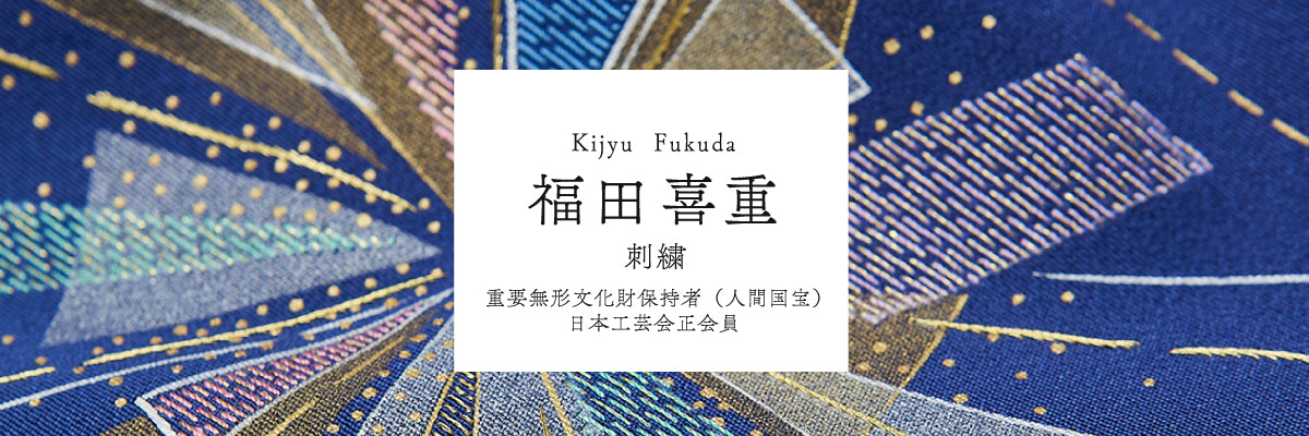 京都の鴨川近くに工房を構える、福田喜重氏。 平成9年に「刺繍」の分野で初めて人間国宝に認定され、 作家活動とともに後継者育成にも力を注いでいます。 自然の移りゆく森羅万象を一枚の布に宿すために一切の妥協を許さず、 生地の選択から、意匠・染・縫・箔の全行程を一貫して手掛けられています。 一針一針で、一瞬一瞬の時を刺し込んでいく刺繍の美。 また、福田喜重氏が「水蒸気文化」と呼ぶ、湿気があるからこその霞や靄で朝焼けや夕焼けが楽しめる日本の景色。福田喜重氏独特の「染足の長い暈し」にはその情景と情緒が表現されています。
