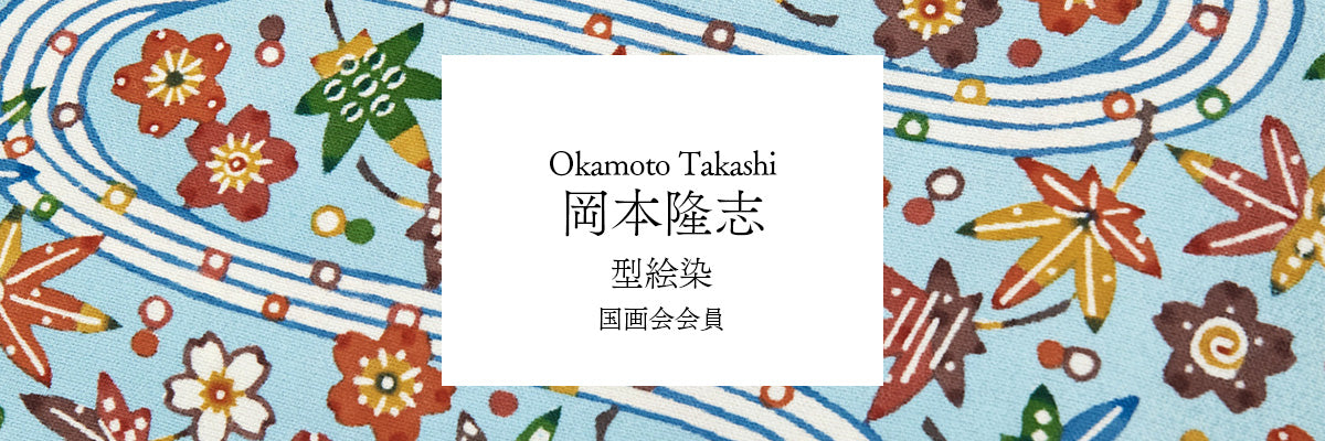 神奈川県湯河原市の工房でものづくりをされる岡本隆志さん。浜松の染物業の家に生まれ、人間国宝・ 芹沢銈介氏に師事。芹沢門下生として出会った型絵染作家・岡本紘子さんとは結婚後も一緒に創作活動を行っています。銀座もとじでは2016年に「二人展」として初個展を開催させていただきました。 「型絵染」とは、1956年に芹沢銈介氏の技法が重要無形文化財に認定された際に他の型染め技法と区別するために名付けられたもので、図案から型彫、防染、染めまでの工程をすべて一人の制作者が一貫して手がけるため、作家の個性がより表現されやすく、創造性豊かな作品が生まれます。 モダンアートのような幾何学模様が楽しい角帯や九寸帯作品で、大人の遊び心と個性を軽やかに演出していただけます。