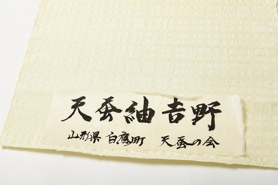白鷹町役場の方が手渡ししてくださった、白鷹町の皆さんの夢と情熱とロマンが詰まった一反。今回は初めて「吉野格子」が織りなされ、天蚕の繭の自然のままの色、優しく淡い黄緑色が光をおびて神秘的な美しさを放っています。この奇跡の反物の完成については、地元の山形新聞でも大きく取り上げられました。(このページ下部に新聞記事の画像がございます)