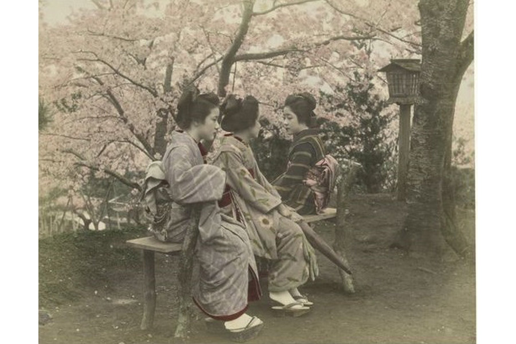 下谷区は、現在の台東区の一部になっている地区。医者の娘と思われる少女は、未婚の女性が結う文金の高髷に、中振りの単衣、緞子のお太鼓、黒塗りのぽっくりという晴れ着姿で、上野・不忍池の蓮を眺めています。