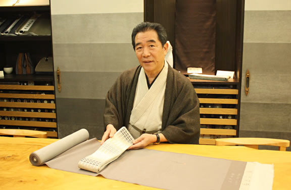 「わたしは、お客様に現代の街並に馴染むきもの姿をご提案していますが、藤山さんの作品は、まさに大変都会的なセンスで制作されています。 わたしの着ているこちらのきものも藤山さんの吉野間道の作品です! 地色は、生成色や白に近いのですが、格子を成す浮織の部分が畝となって、薄銀鼠を感じさせる陰影が醸し出されていて、大変表情豊かなこちらのきものに一目で惚れてしまいました。 このきものは私の勝負服なんです! ここぞ、という大事なときに着させていただく一枚です。自然の草木で丁寧に染められた藤山さんのこの作品は、清清しさを感じさせてくれ、気持ちがとても引き締まるのです。」