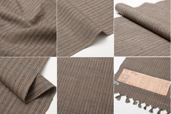 こちらは、おだやかな墨茶地に、薄藍や緑、黄の色糸でごく細い縞模様をなしたひと品。霞のように、すっすっと、天蚕の真綿糸が横に織りなされています。シックな中にも感じる明るさがなんとも絶妙です。