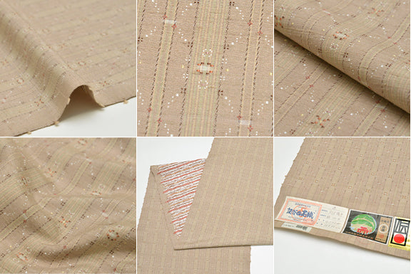 「▽」のようなお柄、こちらの作品では少しアレンジが加えられていますが、「扇花」は、末広がりで子孫繁栄の願いを込めています。 そんな素敵なぬくもりある願いが込めて織られる沖縄の伝統的な読谷山花織にモダンなニュアンスを添えて、【銀座もとじオリジナル】で新たに織りなしたひと品は、やわらかいベージュ色と、クリーム色、ほんのりとした薄緑の縞が織り出された生地に浮かぶ、点描のように繊細な花織模様。 こげ茶、茶おびた珊瑚色、白、橙、ベージュの花綜絖により「銭玉(ジンダマ)」と「風車(カジマヤー)」が小さなリズムを刻んで軽やかにあしらわれています。