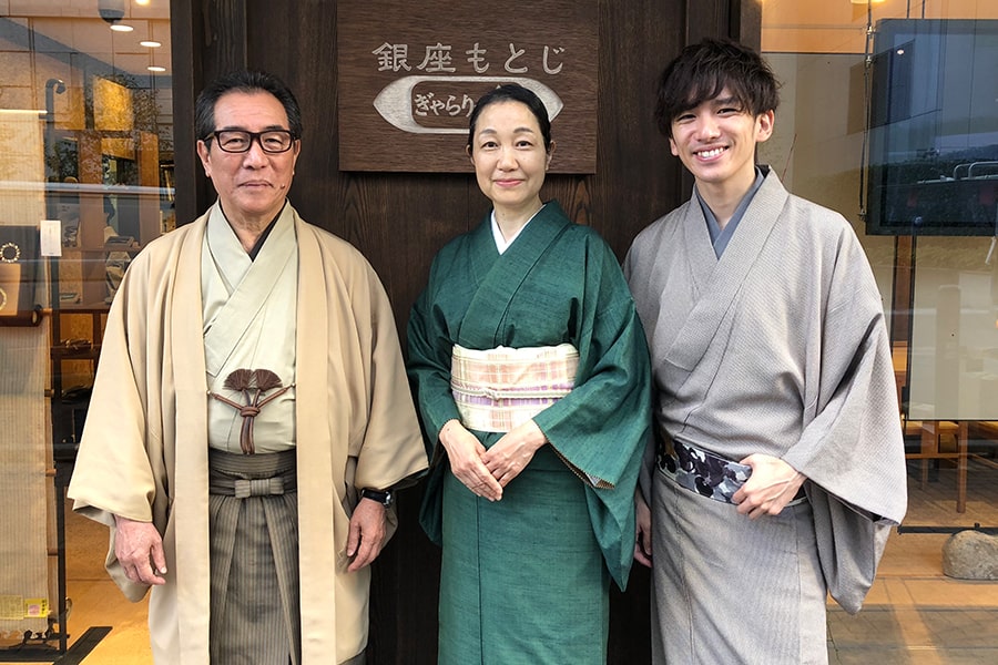 成人式も洋装で参加されるなど着物とは無縁であった会社員時代、偶然目にした大島紬の織りの実演に惹かれたことをきっかけに、運命に導かれるように染織の道へ。会社を辞めて染織の産地・新潟県十日町市の職業訓練校へ一年間通い、修了後は宗廣力三氏創設の工芸研究所に手紙を書いて入所を志願するなど、迷いなき意志とたゆまざる努力により、自らの手で切り拓かれてきたこれまでの道のりを振り返っていただきながら、楽しいお話を伺いました。