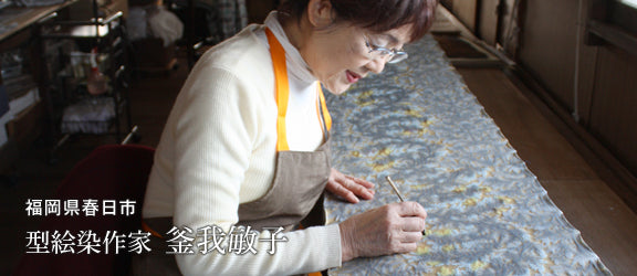 冬空の下、冴えた赤色の山茶花や南天の実が、命いっぱいに膨らんでいます。縁側の向こう、型絵染作家の釜我敏子さんの日々を見つめてきた庭景色に、釜我さんのお人柄を反映したような、ほっこりと暖かな陽射しが差しています。福岡空港から福岡市を出てほど近く、福岡県春日市ちくし台に釜我敏子さんの工房はあります。 釜我敏子さんは、高校をご卒業後にお母様の薦めで習い始めたろうけつ染めをきっかけに、自らの手でものをつくることの楽しさに目覚めます。