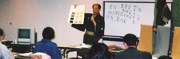 宮本武蔵と対峙した吉岡一門から吉岡家へと続く染色の歴史、当時大流行となったと言われる「吉岡憲法黒」、「吉岡憲法茶」の染色方法。特に資料に残された方法では、なかなか本物の黒が染まらず、苦労したお話など、時にあちこち脱線しながらの楽しいお話で、会場は笑い声の絶えない和やかな雰囲気でした。