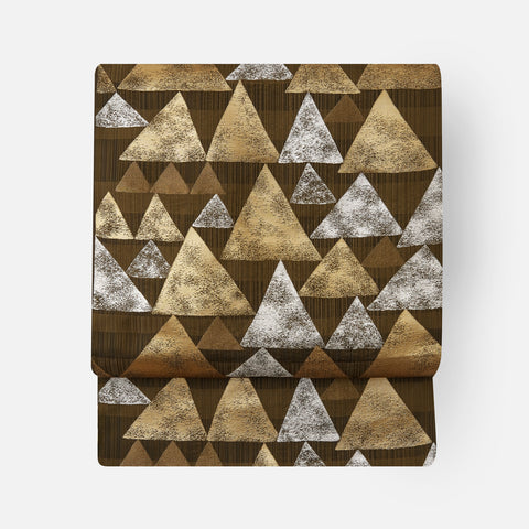 クリムトの画に描かれた複雑な表情に菱型の文様が見え隠れする様を織で表現しています。三色の色が複雑に交差するように組み合わせ、ポイントとして菱模様の表面が変化しながら浮かび上がるように織り上げています。色の組み合わせが従来の作品より変化を増しており、着物とのコーディネートを楽しんで頂けると思います。
