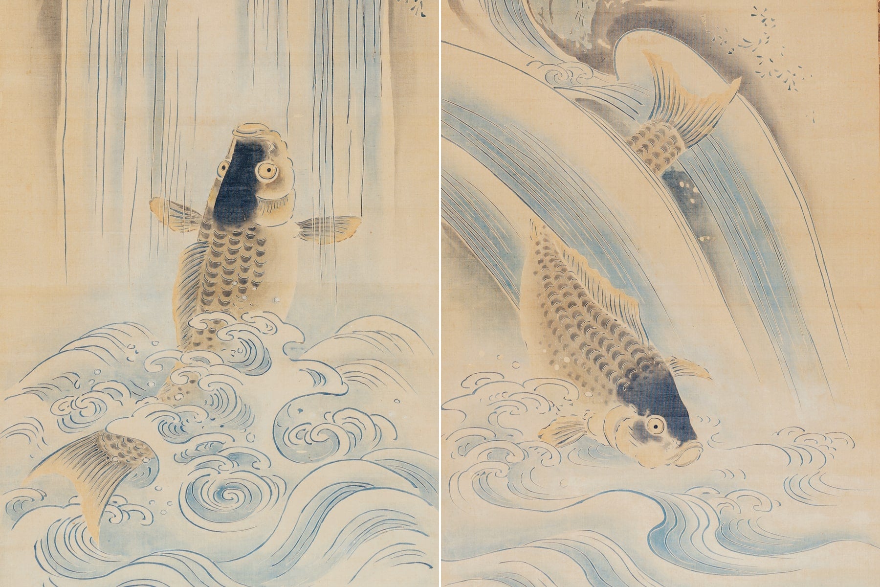 猩猩に上り鯉下り鯉図 三幅対友禅染掛軸