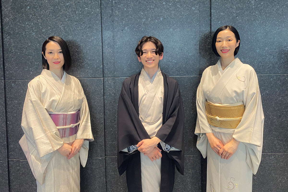 写真左より、広報・清水、二代目・泉二啓太、女性のきもの店長・野田。