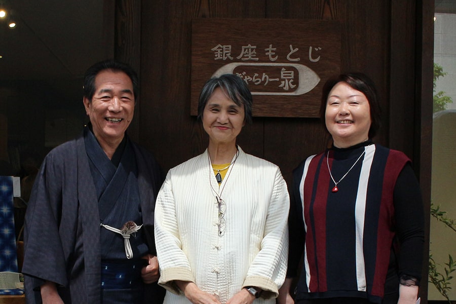 2019年5月10日(金)から12日(日)まで、銀座もとじ和織にて「空間に溶けゆく布 ― 上原美智子のあけずば織」展を開催。11日(土)の朝10時からは「和織物語」を執筆してくださった多摩美術大学教授・外舘和子さんをお招きしてぎゃらりートークを、さらに11日(土)、12日(日)の午後3時からは作品解説のミニトーク会を行いました。