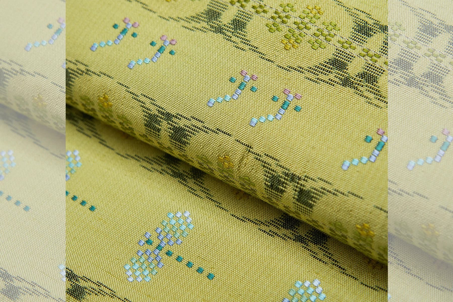(上写真) 運天裕子作 九寸名古屋帯「叢(くさむら)」くさむらで飛び交うトンボとヤゴを表現。