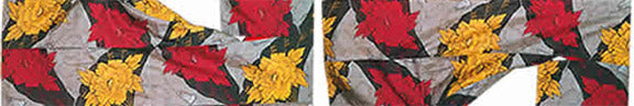 一方、紬の文様も従来の縞、格子などの幾何学的な柄から、花鳥の曲線文様を織り出す技法が考案されました。登山伊次郎氏(大正13年61歳で没。日本教図社長、登山俊彦氏の父)が苦心の末に、花鳥の絵の上に糊付けした絹糸を並べて墨で印をつけ、手括りで絣を作り、染色して花鳥の絵文様を織り出す技法を考案したのです。今で言う、「笠利赤木名地方の庸実柄」「龍郷地方の龍郷柄」が盛んに生産されたのはこの頃のことです。